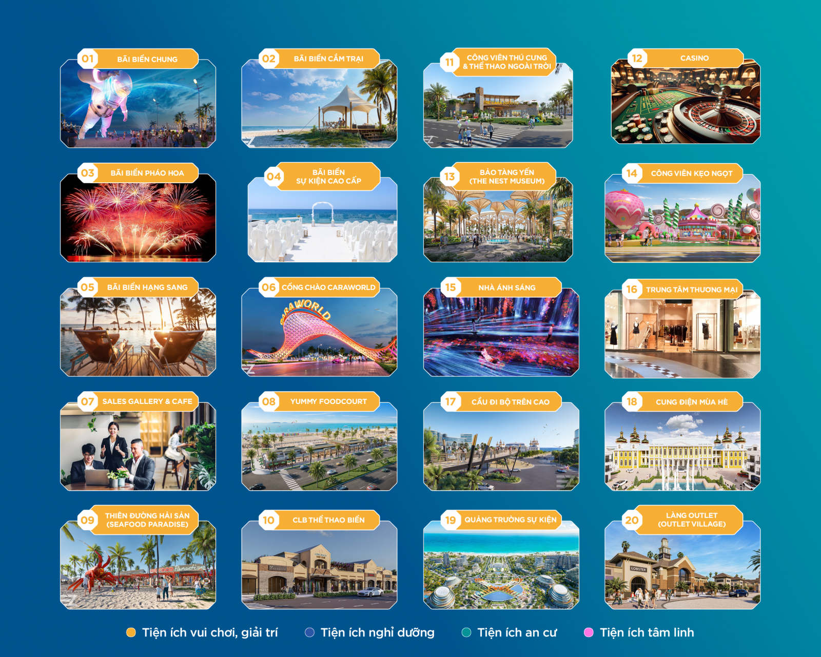 Từ những khoảnh khắc thư giãn bên bờ biển thơ mộng đến trải nghiệm thể thao chuyên nghiệp trên sân golf 27 lỗ, từ các lễ hội văn hóa đa sắc màu cho đến sự kiện tầm cỡ châu lục. Dù quý khách đang tìm kiếm không gian vui chơi giải trí, chăm sóc sức khỏe, hay khám phá ẩm thực đa dạng, Caraworlds đều đảm bảo đáp ứng đầy đủ với chất lượng mang tầm quốc tế.